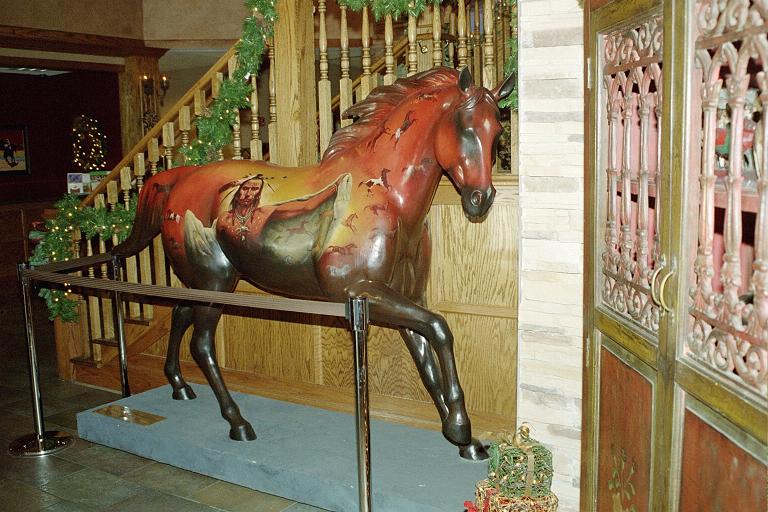 The pony sits in the hotel's main lobby, directly across from the registration desk, near the entry into the restaurant. It's a rather magnificent work with wonderful detail depicting an Indian shaman letting forth the ponies under his control.