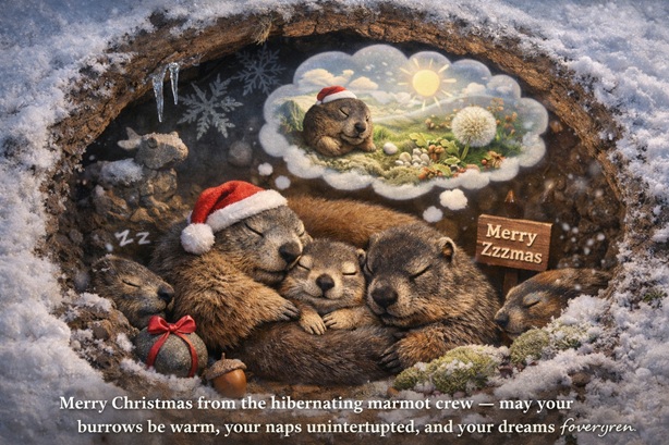 Merry Christmas from the hibernating marmot crew, celebrating responsibly by lowering heart rates and canceling consciousness.