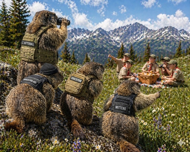 Farther upslope, the Alpine Marmot Commandos were already alert. They had not seen the basket yet, but they felt it. Lt. Butterball lowered his binoculars with the solemn gravity of a marmot who had trained his entire life for this exact moment.