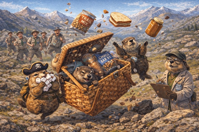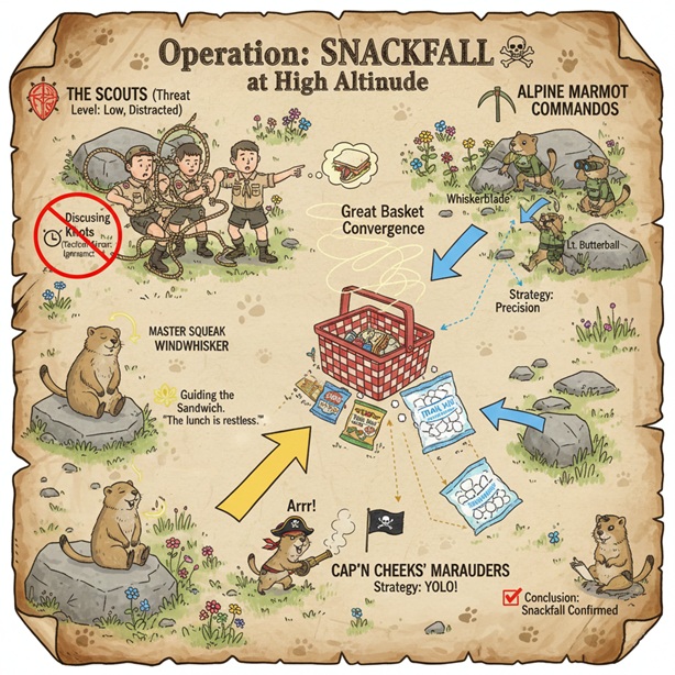 In less than thirty seconds, it was over. The basket dropped back to the ground, empty and faintly ashamed. The marmots vanished into grass, rock and legend. The scouts were left with questions, crumbs and a large ambiguous knot to untangle. Future encounters with wicker would require therapy sessions.